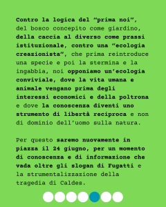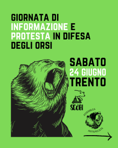 Contro la logica del “prima noi”, del bosco concepito come giardino, della caccia al diverso come prassi istituzionale, contro una “ecologia creazionista”, che prima reintroduce una specie e poi la stermina e la ingabbia, noi opponiamo un’ecologia conviviale, dove la vita umana e animale vengano prima degli interessi economici e della poltrona e dove la conoscenza diventi uno strumento di libertà reciproca e non di dominio dell’uomo sulla natura. Per questo saremo nuovamente in piazza il 24 giugno, per un momento di conoscenza e di informazione che vada oltre gli slogan di Fugatti e la strumentalizzazione della tragedia di Caldes