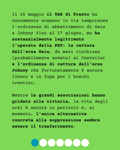 Il 25 maggio il TAR di Trento ha nuovamente sospeso in via temporanea l’ordinanza di abbattimento di Gaia e Johnny fino al 27 giugno, ma ha sostanzialmente legittimato l’operato della PAT: la cattura dell’orsa Gaia, da mesi rinchiusa (probabilmente sedata) al Casteller e l’ordinanza di cattura dell’orso