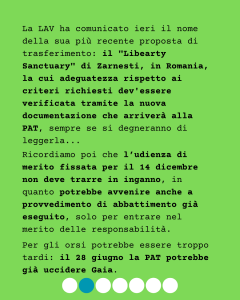 Sanctuary” di Zarnesti, in Romania, la cui adeguatezza rispetto ai criteri richiesti dev’essere verificata tramite la nuova documentazione che arriverà alla PAT, sempre se si degneranno di leggerla… Ricordiamo poi che l’udienza di merito fissata per il 14 dicembre non deve trarre in inganno, in quanto potrebbe avvenire anche a provvedimento di abbattimento già eseguito, solo per entrare nel merito delle responsabilità. Per gli orsi potrebbe essere troppo tardi: il 28 giugno la PAT potrebbe già uccidere Gaia.
