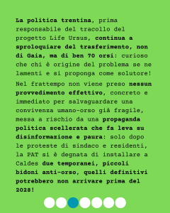 La politica trentina, prima responsabile del tracollo del progetto Life Ursus, continua a sproloquiare del trasferimento, non di Gaia, ma di ben 70 orsi: curioso che chi è origine del problema se ne lamenti e si proponga come solutore! Nel frattempo non viene preso nessun provvedimento effettivo, concreto e immediato per salvaguardare una convivenza umano-orso già fragile, messa a rischio da una propaganda politica scellerata che fa leva su disinformazione e paura: solo dopo le proteste di sindaco e residenti, la PAT si è degnata di installare a Caldes due temporanei, piccoli bidoni anti-orso, quelli definitivi potrebbero non arrivare prima del 2028!