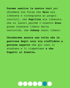 Faremo sentire le nostre voci per chiedere con forza che Gaia sia liberata e ricongiunta ai propri cuccioli, che Papillon sia liberato, che si lavori perché l’orsetto Nino possa crescere libero dalla cattività, che Johnny resti libero. Chiederemo ancora una volta che la gestione degli orsi sia riaffidata a persone esperte che gli orsi li studiano e li rispettano e che Fugatti si dimetta.
