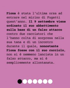 Fiona è stata l’ultima orsa ad entrare nel mirino di Fugatti quest’anno. Il 9 settembre viene ordinato il suo abbattimento sulla base di un falso attacco contro due cacciatori che l’hanno colta di sorpresa nella sua tana e di un incontro durante il quale, nonostante Fiona fosse con il suo cucciolo, non si è nemmeno lanciata in un falso attacco, ma si è semplicemente allontanata. I ricorsi delle associazioni sono risultati nella sospensione dell’ordinanza di abbattimento, ma allo stesso nella disposizione della sua cattura.