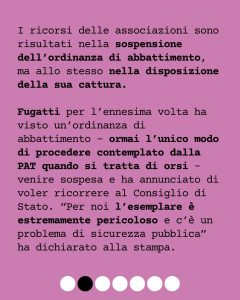 Fugatti per l’ennesima volta ha visto un’ordinanza di abbattimento – ormai l’unico modo di procedere contemplato dalla PAT quando si tratta di orsi – venire sospesa e ha annunciato di voler ricorrere al Consiglio di Stato. “Per noi l’esemplare è estremamente pericoloso e c’è un problema di sicurezza pubblica” ha dichiarato alla stampa.
