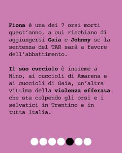 Fiona è una dei 7 orsi morti quest’anno, a cui rischiano di aggiungersi Gaia e Johnny se la sentenza del TAR sarà a favore dell’abbattimento. Il suo cucciolo è insieme a Nino, ai cuccioli di Amarena e ai cuccioli di Gaia, un’altra vittima della violenza efferata che sta colpendo gli orsi e i selvatici in Trentino e in tutta Italia.