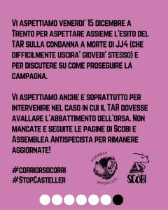 Vi aspettiamo venerdì 15 dicembre a Trento per aspettare assieme l’esito del tar sulla condanna a morte di jj4 (che difficilmente uscirà giovedì stesso) e per discutere su come proseguire la campagna.