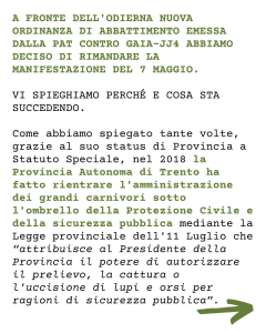 A FRONTE DELL’ODIERNA NUOVA ORDINANZA DI ABBATTIMENTO EMESSA DALLA PAT CONTRO GAIA-JJ4 ABBIAMO DECISO DI RIMANDARE LA MANIFESTAZIONE DEL 7 MAGGIO.