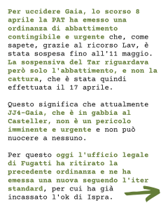 Per uccidere Gaia, lo scorso 8 aprile la PAT ha emesso una ordinanza di abbattimento contingibile e urgente che, come sapete, grazie al ricorso Lav, è stata sospesa fino all’11 maggio. La sospensiva del Tar riguardava però solo l’abbattimento, e non la cattura, che è stata quindi effettuata il 17 aprile. Questo significa che attualmente JJ4-Gaia, che è in gabbia al Casteller, non è un pericolo imminente e urgente e non può nuocere a nessuno. Per questo oggi l’ufficio legale di Fugatti ha ritirato la precedente ordinanza e ne ha emessa una nuova seguendo l’iter standard, per cui ha già incassato l’ok di Ispra. Questo cosa significa? Significa che l’11 maggio è altamente probabile che non essendoci più alcun procedimento, in quanto l’ordinanza è stata ritirata, il TAR dichiari non si deve pronunciare su nulla. A quel punto, scaduto il termine della data, in base alla attuazione della seconda ordinanza, Fugatti può uccidere Gaia-JJ4.