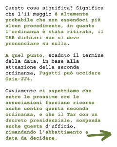 Ovviamente ci aspettiamo che entro le prossime ore le associazioni facciano ricorso anche contro questa seconda ordinanza, e che il Tar con un decreto presidenziale, sospenda anche questa d’ufficio, rimandando l’abbattimento a data da decidere.