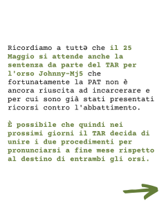 Ricordiamo a tuttə che il 25 Maggio si attende anche la sentenza da parte del TAR per l’orso Johnny-Mj5 che fortunatamente la PAT non è ancora riuscita ad incarcerare e per cui sono già stati presentati ricorsi contro l’abbattimento. È possibile che quindi nei prossimi giorni il TAR decida di unire i due procedimenti per pronunciarsi a fine mese rispetto al destino di entrambi gli orsi.