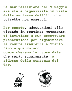 La manifestazione del 7 maggio era stata organizzata in vista della sentenza dell’11, che potrebbe non esserci. Per questo, adeguandoci alle vicende in continuo mutamento, vi invitiamo a NON effettuare prenotazioni per organizzare la vostra trasferta a Trento fino a quando non comunicheremo la nuova data che sarà, sicuramente, a ridosso della sentenza del Tar.