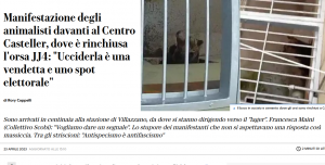 Apr 29 2023 Off [Gallery] Giornata di protesta al Casteller – 23 aprile 2023 By stopcasteller Una selezione di scatti dalla bellissima manifestazione del 23 aprile al Casteller. Leggi gli interventi della giornata e seguici sui social di scobi collettiva o assemblea antispecista per rimanere sempre aggiornata sulla campagna Post navigation Previous PostPrevious Alpinismo molotov – sbatti l’orso in prima paginaNext PostNext Rinvenuto il corpo senza vita dell’orso M62 “Amir”
