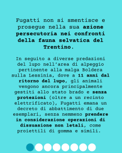 Fugatti non si smentisce e prosegue nella sua azione persecutoria nei confronti della fauna selvatica del Trentino. In seguito a diverse predazioni del lupo nell’area di alpeggio pertinente alla malga Boldera sulla Lessinia, dove a 11 anni dal ritorno del lupo, gli animali vengono ancora principalmente gestiti allo stato brado e senza protezioni (oltre a un recinto elettrificato), Fugatti emana un decreto di abbattimento di due esemplari, senza nemmeno prendere in considerazione operazioni di dissuasione non letali, come proiettili di gomma e simili.