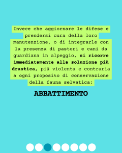 Trattandosi comunque di una modalità di difesa che si era dimostrata di successo ma comunque sperimentale, sembrerebbe ragionevole pensare a come migliorarla anche sulla base degli sviluppi dei comportamenti predatori del lupo, ma invece che aggiornare le difese e prendersi cura della loro manutenzione, o di integrarle con la presenza di pastori e cani da guardiana in alpeggio, si ricorre immediatamente alla soluzione più drastica, più violenta e contraria a ogni proposito di conservazione della fauna selvatica, L’ABBATTIMENTO.