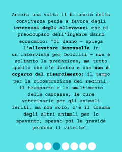 Ancora una volta il bilancio della convivenza pende a favore degli interessi degli allevatori che si preoccupano dell’ingente danno economico: “Il danno – spiega l’allevatore Bazzanella in un’intervista per Il Dolomiti – non è soltanto la predazione, ma tutto quello che c’è dietro e che non è coperto dal risarcimento: il tempo per la ricostruzione dei recinti, il trasporto e lo smaltimento delle carcasse, le cure veterinarie per gli animali feriti, ma non solo, c’è il trauma degli altri animali per lo spavento, spesso poi le gravide perdono il vitello” (scappa una smorfia amara nel leggere come anche lo spavento di animali sfruttati e destinati al macello preoccupi i loro carcerieri o come anche questa possa essere un’argomentazione funzionale soltanto ad aumentare l’ostilità verso lupi e orsi).