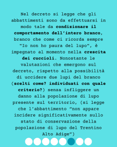 Nel decreto si legge che gli abbattimenti sono da effettuarsi in modo tale da condizionare il comportamento dell’intero branco, branco che come ci ricorda sempre Io non ho paura del lupo, è impegnato al momento nella crescita dei cuccioli. Nonostante le valutazioni che emergono sul decreto, rispetto alla possibilità di uccidere due lupi del branco (scelti come? individuati con quale criterio?) senza infliggere un danno alla popolazione di lupo presente sul territorio, (si legge che l’abbattimento “non appare incidere significativamente sullo stato di conservazione della popolazione di lupo del Trentino Alto Adige”). Appare legittimo sollevare dubbi al riguardo, vista la fase delicata costituita dalla presenza dei cuccioli e dal fatto che si tratterebbe di una prima volta e quindi di un’operazione sperimentale i cui danni non sono calcolabili in modo così netto.