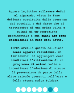 ISPRA avvalla questa soluzione senza opporre resistenze, ma limitandosi ad aggiungere come condizioni l’attivazione di un programma di azioni volte a incentivare l’adozione di misure di prevenzione da parte delle altre aziende presenti nell’area e della stessa malga Boldera. Valuta anche come adeguate le recinzioni presenti che i lupi sono riusciti a superare ma abbiamo ragione di dubitarne anche da quanto possiamo vedere nel video diffuso dall’Associazione Bearsandothers , dove si osserva un generale stato di abbandono e decadimento.