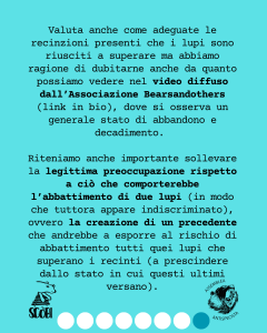 Riteniamo anche importante sollevare la legittima preoccupazione rispetto a ciò che comporterebbe l’abbattimento di due lupi (in modo che tuttora appare indiscriminato), ovvero la creazione di un precedente che andrebbe a esporre al rischio di abbattimento tutti quei lupi che superano i recinti (a prescindere dallo stato in cui questi ultimi versano).