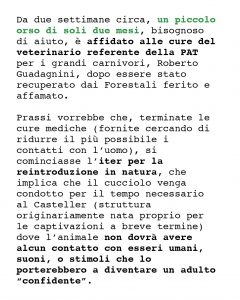 Da due settimane circa, un piccolo orso di soli due mesi, bisognoso di aiuto, è affidato alle cure del veterinario referente della PAT per i grandi carnivori, Roberto Guadagnini, dopo essere stato recuperato dai Forestali ferito e affamato. Prassi vorrebbe che, terminate le cure mediche (fornite cercando di ridurre il più possibile i contatti con l’uomo), si cominciasse l’iter per la reintroduzione in natura, che implica che il cucciolo venga condotto per il tempo necessario al Casteller (struttura originariamente nata proprio per le captivazioni a breve termine) dove l’animale non dovrà avere alcun contatto con esseri umani, suoni, o stimoli che lo porterebbero a diventare un adulto “confidente”.