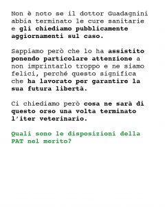Ci chiediamo però cosa ne sarà di questo orso una volta terminato l’iter veterinario. Quali sono le disposizioni della PAT nel merito?