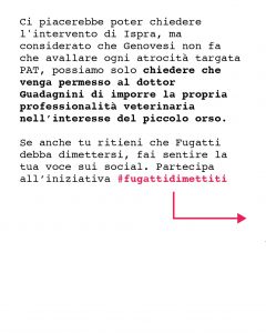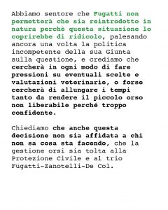 Chiediamo che anche questa decisione non sia affidata a chi non sa cosa sta facendo, che la gestione orsi sia tolta alla Protezione Civile e al trio Fugatti – Zanotelli – De Col. Ci piacerebbe poter chiedere l’intervento di Ispra, ma considerato che Genovesi non fa che avallare ogni atrocità targata PAT, possiamo solo chiedere che venga permesso al dottor Guadagnini di imporre la propria professionalità veterinaria nell’interesse del piccolo orso.