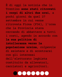 È di oggi la notizia che in Trentino sono stati ritrovati i corpi di altri due orsi, a pochi giorni da quel 27 settembre in cui venne ritrovata Fiona (F36), l’orsa che la Provincia stava cercando di abbattere a tutti i costi, agendo in accordo con la sua politica di intolleranza verso la popolazione ursina, colpevole di esistere e di scontrarsi con gli interessi dell’elettorato leghista costituito da allevatori, cacciatori e agricoltori.