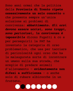 Sono anni ormai che la politica della Provincia di Trento ripete ossessivamente un solo concetto e che presenta sempre un’unica soluzione ai problemi di convivenza: abbattimento. “Gli orsi devono essere uccisi, sono troppi, sono pericolosi, la convivenza è impossibile“ dicono Fugatti & co e per perseguirli la PAT ha inventato la categoria di orso problematico, che usa per tacciare di pericolosità ogni orso che ha la malaugurata sorte di incontrare un umano sulla sua strada, che sceglie di predare animali d’allevamento – evidentemente non difesi a sufficienza – o anche solo di rubare albicocche in un frutteto.