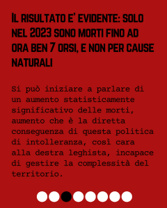 IL RISULTATO È EVIDENTE: SOLO NEL 2023 SONO MORTI FINO AD ORA BEN 7 ORSI, E NON PER CAUSE NATURALI. Si può iniziare a parlare di un aumento statisticamente significativo delle morti, aumento che è la diretta conseguenza di questa politica di intolleranza, così cara alla destra leghista, incapace di gestire la complessità del territorio.