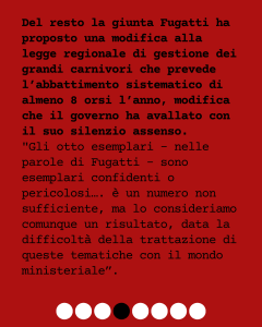 Del resto la giunta Fugatti ha proposto una modifica alla legge regionale di gestione dei grandi carnivori che prevede l’abbattimento sistematico di almeno 8 orsi l’anno, modifica che il governo ha avallato con il suo silenzio assenso. “Gli otto esemplari – nelle parole di Fugatti – sono esemplari confidenti o pericolosi…. è un numero non sufficiente, ma lo consideriamo comunque un risultato, data la difficoltà della trattazione di queste tematiche con il mondo ministeriale”.