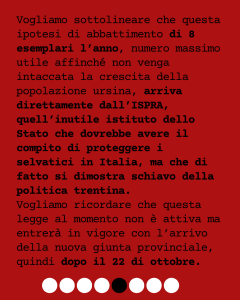 Vogliamo sottolineare che questa ipotesi di abbattimento di 8 esemplari l’anno, numero massimo utile affinché non venga intaccata la crescita della popolazione ursina, arriva direttamente dall’ISPRA, quell’inutile istituto dello Stato che dovrebbe avere il compito di proteggere i selvatici in Italia, ma che di fatto si dimostra schiavo della politica trentina. Vogliamo ricordare che questa Legge al momento non è attiva ma entrerà in vigore con l’arrivo della nuova giunta provinciale, quindi dopo il 22 di ottobre.