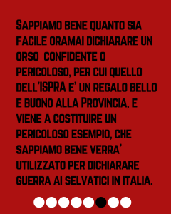 SAPPIAMO BENE QUANTO SIA FACILE ORAMAI DICHIARARE UN ORSO CONFIDENTE O PERICOLOSO, PER CUI QUELLO DELL’ISPRA È UN REGALO BELLO E BUONO ALLA PROVINCIA, E VIENE A COSTITUIRE UN PERICOLOSO ESEMPIO, CHE SAPPIAMO BENE VERRA’ UTILIZZATO PER DICHIARARE GUERRA AI SELVATICI IN ITALIA.