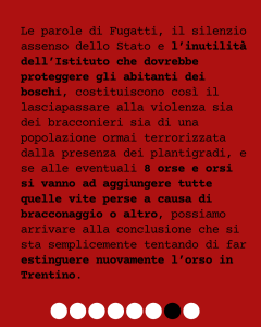 Le parole di Fugatti, il silenzio assenso dello Stato e l’inutilità dell’Istituto che dovrebbe proteggere gli abitanti dei boschi, costituiscono così il lasciapassare alla violenza sia dei bracconieri sia di una popolazione ormai terrorizzata dalla presenza dei plantigradi, e se alle eventuali 8 orse e orsi si vanno ad aggiungere tutte quelle vite perse a causa di bracconaggio o altro, possiamo arrivare alla conclusione che si sta semplicemente tentando di far estinguere nuovamente l’orso in Trentino.